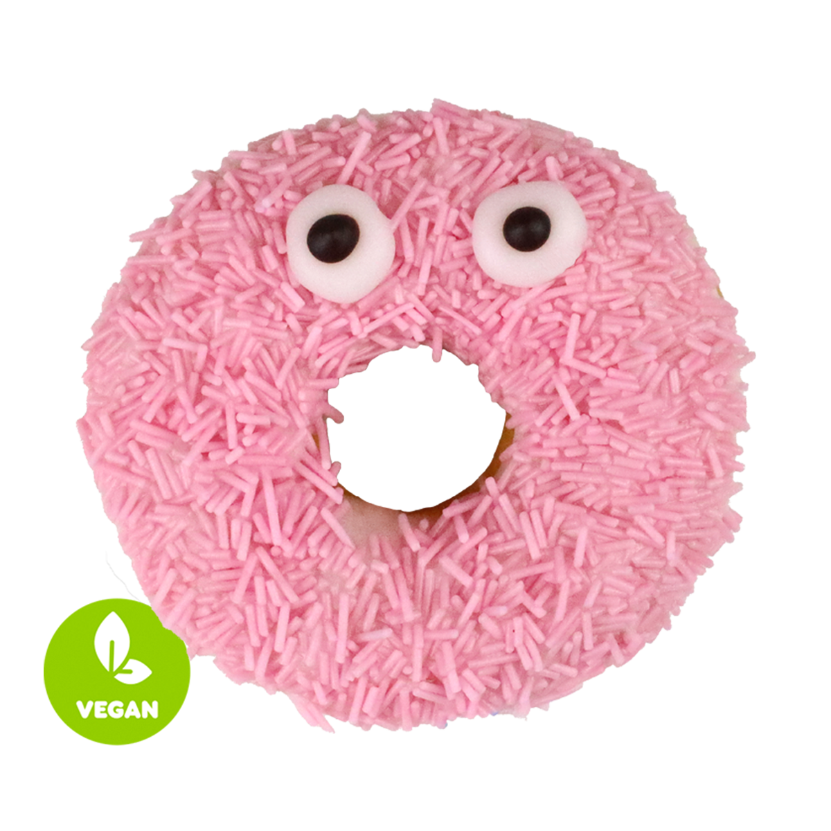ungefüllt, überzogen mit rosa Erdbeerglasur und bunten Zuckerstreuseln (vegan)